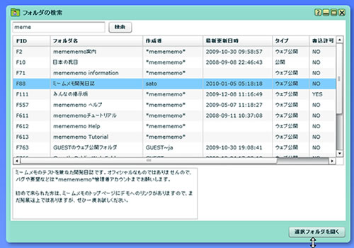 このコマンドを選択すると、フォルダ検索画面が表示されますので、ここで条件を入力し、該当する公開フォルダがあれば、それを選択して開くボタンをクリックすることで、そのフォルダを開くことができます。