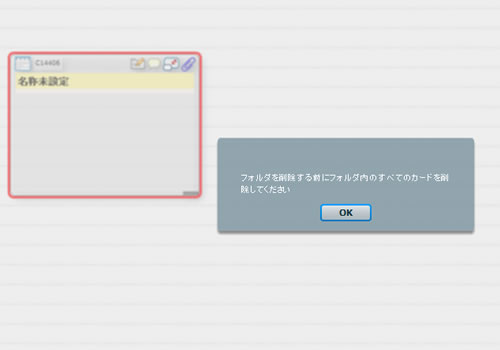 1枚でもカードが存在するフォルダの場合はカードをすべて削除しないとフォルダを削除できない旨のダイアログが開きます。