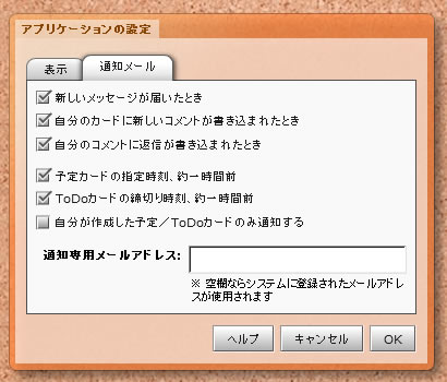通知メールとはリマインダー(告知)メールとも呼ばれるものです。 予定カードの開始時刻やToDoの〆切に時刻が設定されている場合に1時間ほど前に通知メールを送信したり、メッセージやコメントの記入を受けた際にメールでその旨を告知するように設定できます。 ここでは以下の項目を設定できます。 [新しいメッセージが届いたとき] メッセージボックスに新しいメールが届くと通知メールでお知らせします。 [自分のカードに新しいコメントが書き込まれたとき] 自分の作成したカードに対してコメントが書き込まれたときに通知メールでお知らせします。 [自分のコメントに返信が書き込まれたとき] 自分のコメントに返信が書き込まれたときに通知メールでお知らせします。 [予定カードの指定時刻、約一時間前] 予定カードに開始時刻が記入されている場合、その約1時間前に通知メールでお知らせします。 [ToDoカードの締切り時刻、約一時間前] ToDoカードに〆切時刻が記入されている場合、その約1時間前に通知メールでお知らせします。 [自分が作成した予定/ToDoカードのみ通知する] 上記の予定カードやToDoカードの通知は、自分が購読しているフォルダ上の他人のカードについても告知されます。 もし自分で作成した予定カード/ToDoカードの時刻のみ通知したい場合はこちらにチェックを入れてください。 [通知専用メールアドレス] 通知専用のメールアドレスを設定できます。 空欄ならシステムに登録されたデフォルトのメールアドレスが使用されます ※通知メールは1時間~1時間半前に送信されますが、サーバの処理状況、回線状況及び受信するプロバイダーのメール受信サーバなどによって時間通りに送受信できない可能性がありますことをご了承ください。 |