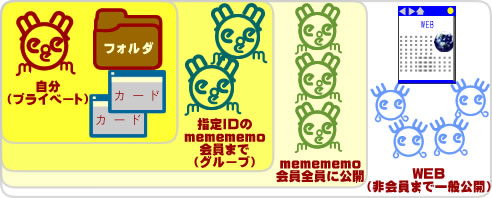 初期状態ではフォルダは「ホーム」フォルダのみとなっています。 このフォルダは削除できず、フォルダの公開など閲覧/書込許可の変更もできません。 ユーザはこのホームフォルダ以外に用途に応じて自分のフォルダを複数作成することができます。 ログインすると起動時に表示される画面(デスクトップ)がホームフォルダです。 ホームフォルダだけは削除することはできず、他の人に公開することもできない、あなただけの個人用フォルダです。 ホームフォルダ以外にも新規にフォルダを追加作成することができます。ホームフォルダ以外のフォルダは削除もできます。 また、フォルダの公開する範囲(閲覧権限)を以下の4種類のいずれかに設定できます。 1) 自分だけ 2)グループ内(指定したIDの人だけ閲覧可能) 3)不特定( 誰でも閲覧可能) 4)WEBで公開 (書込を許可する権限も同じく4種類のいずれかに設定できます) 例えば、自分だけのプライベートな情報フォルダ、ブログ型で広くウェブで公開するフォルダ、Wikiのように友達と一緒に情報やデータを蓄積・共有していくグループフォルダと、 フォルダを公開範囲や用途によって使い分けることができるのです。 あなたのフォルダを自分以外に公開する設定にすれば、他の会員があなたのフォルダ内を閲覧できるようになります。 書込も可能にすれば、他人があなたのフォルダ内にカードを追加できるようになります。 逆にあなたは公開されている他人のフォルダを検索したり、カードを追加したりすることもできます。 良く訪問する他人のフォルダは「購読」することで、フォルダを開く際に自分のフォルダの下にリストアップされます。 |
