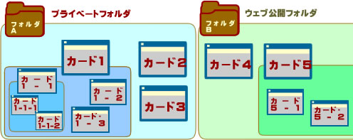 フォルダを分けるほどではないけど、画面に数十枚もカードを配置するとカードが重なってよくわからなくなってしまいます。 そこで便利なのがカードの階層構造です。 というと難しそうですが、カードの中にサブカードを作れるということです。つまりカードをフォルダのように使うこともできるわけです。 (ただしフォルダと違ってカード単位で閲覧や書込権限の設定はできません) 例えば、ホームフォルダ内に、テキストカードで「住所録」というカードを作ります。 そして、その「住所録」カードの下の階層(サブカード)を開いて、そこにあなたの友達のアドレスカードを複数作るのです。 更に友達のアドレスカードのサブカードにその友達の写真カードを追加するということも可能です。 構造的には ホームフォルダ >住所録カード >友達Aさんのアドレスカード >Aさんの写真カード という感じです。 このようにカードを階層化することで、フォルダと同様、データをわかりやすく整理することができます。 最初からどこにカードを置くか悩む必要はありません。 まずホームフォルダ内にメモとかアドレスとか予定とか、いろんなデータカードを追加していき、後で種類や目的に応じて、サブカードや別のフォルダに移動させることで整理することができるわけです。 いかがでしょう?フォルダとカードの考え方がおわかりいただけましたか? 慣れている方なら、チュートリアルを試さなくても感覚的に操作できると思いますが、以下のチュートリアルステップに従って、試しにデータを作っていきましょう! 心配せずとも、カードはもちろん、 ホームフォルダ自体以外のフォルダはいつでも削除できますので、まずはなんでもいいからカードを追加してみてください。 |