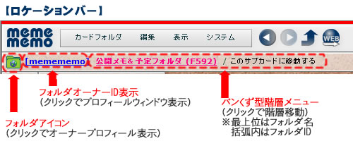 ロケーションバーのフォルダアイコンの右には現在開いているフォルダ名が表示されています。 この右には、通常のウェブサイトでみかけるパンくずメニューのような表示があります。 これは、現在開いている階層を表現しています。 一番左がフォルダ名で、それ以降はカード名(サブカード名)が並びます。 これらのいずれかをクリックすることで、その階層を開くことができます。 |