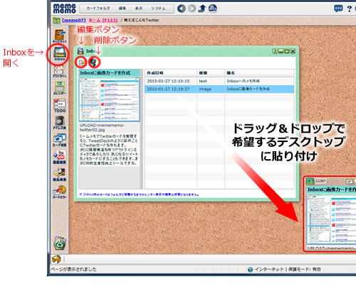Inboxトレイは、新しくカードを追加する際に、現在開いているデスクトップ(フォルダ/サブカード)上に作成せず、一時的に保存しておくための場所です。 ここにカードを保存するには、新規カードを作成する際のダイアログボックスの下部にある「Inboxに作成」オプションにチェックを入れてから作成します。 (現在開いているデスクトップが他人のフォルダなどで書込禁止の場合、カードを作成する際にはInboxにしか作成できませんので、このオプションがデフォルトで選択されており、グレーアウトしてチェックを外すことはできません) Inboxにカードがある場合は、左サイドのInboxアイコンにカードの絵が表示されていますので、これをクリックするとInbox内カードリストが表示されます。 ここでリストをクリックすれば、そのカードを左側でプレビュー表示できます。 編集したい場合はリストのカード行をダブルクリックするか、選択してから上部の編集ボタンをクリックして下さい。 削除するにはカード行を選択して上部の削除ボタンをクリックして下さい。 Inbox上のカードをフォルダに移動するには、リストのカード行をクリックしたままドラッグして、現在開いているデスクトップへドロップして下さい。 (Inboxへ戻すことはできません) 【注意事項】 Inboxは通常のフォルダと異なりますので、Inbox内のカードは検索対象にはなりません。 また、予定カードやToDoカードで日付が入っていてもカレンダー上には表示されません。 |