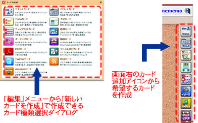 カードを追加したい場合、カードメニューから希望する新規カード追加コマンドを選択します。 また、画面の右サイドに並んでいるカード追加アイコンをクリックするだけですぐにカードを追加できます。 通常カードを新規に追加する際には、現在表示されているデスクトップ(フォルダやサブカード)上に作成されます。 ただし、新規カード編集ダイアログで「Inboxに作成」オプションにチェックする(書込禁止フォルダ上での追加選択時も同様)と、Inboxトレイ内に作成されます。 |