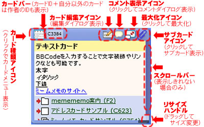 ミームメモには様々な種類のカードがあります。 カードは共通して以下のようなアイコンや操作用のハンドル(クリック部分)を持っています。 【カードバー】 カード最上部の濃紺の部分になります(アイコンを除く)。 ここをクリックするとカードを選択できます。 【カード種類アイコン】 カードバーの左端にあるアイコンはカードアイコンで、カードの種類を表しています。 クリックするとカードメニューが表示されます。(カード種類によってカードメニューは異なります) 【カード編集アイコン】 鉛筆マークのアイコンで、カード内容を編集するダイアログを開きます。 【コメントアイコン】 カードバーの右側にある吹き出し状のアイコンで、ここをクリックするとコメント入力ダイアログが表示されます。 【サブカードアイコン】 下向きの矢印アイコンです。これをクリックすると、このカードのサブカード(下層にあるカード)を開きます。 なお、サブカードを持っているカードの場合、矢印が黄色になっています(初期状態は青色)。 【最大化アイコン】 カードバーの右端にあるアイコンで、これをクリックすると、このカードを最大化して表示します。 元のサイズに戻すには再度クリックします。 【スクロールバー】 表示領域内にカード内容が収まりきらない場合、右サイドにスクロールバーが表示されます。 【リサイズハンドル】 カードのサイズは任意に変更できます。 サイズを変更するには、カード右下角にある茶色の部分=リサイズハンドルをクリックしたままマウスを動かすことでカードサイズを変更できます。 希望するサイズになったらマウスボタンを放してください。 |