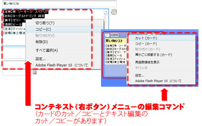 カードの最上部(アイコン以外)をダブルクリックすると、カード編集ダイアログが表示されます。 カード上のテキストをコピー/カット/ペーストするには、この編集ダイアログ上だけでなく、カード上のテキストを直接編集することもできます。 マウスでテキストの範囲を選択してからショートカットコマンドを使うか、マウスの右ボタンをクリックしてコマンドを選択します。 【テキスト編集用ショートカット】 矢印キー:テキスト内での移動 Shift + 矢印キー:選択 Ctrl + X:選択した文字列のカット Ctrl + C:選択した文字列のコピー Ctrl + V:クリップボード上の文字列のペースト Tab:次の入力欄へ Shift + Tab:前の入力欄へ |