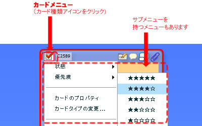 ドラッグ&ドロップによって、選択したカードを別のカードのサブカードに移動することができます。 それには以下の手順で行います。 1)サブカードにするカードをクリックして選択します。SHIFTキーやCTRLキーを押したまま選択することで複数選択も可能です。 2)選択したら、そのカードの余白をクリックしたままマウスを動かして移動(ドラッグ)します。 3)サブカードを持たせる対象となるカードの右上にあるサブカード表示アイコンにマウスカーソルを合わせると、サブカード移動矢印マークが表示されます。 4)そこでマウスボタンを放す(ドロップする)と、ドラッグしたカードが画面から消え、対象カードのサブカードに移動します。 |