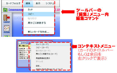 カードを選択状態にして「カード」メニューからカット/コピーすることができます。 カードを選択するにはカードの最上部(アイコン以外)をクリックします。すると色が変わります。これが選択された状態です。 カードを選択してから、そのカードの最上部を右クリックしても、同様にコンテキストメニューで「カット/コピー/ペースト」が選択できます。 次に説明するテキスト編集と区別するように「カット(カード)」「コピー(カード)」と表示されます。 [カット] カードを1つもしくは複数選択してカットを選択し、別のフォルダやカードのサブフォルダなどに移動してからペーストすれば、元の位置からペースト先に移動されます。 [コピー] コピーの場合はカットと異なり、単独のカード1枚のみしかコピーできません。複数選択した状態ではコピーメニューが表示されません。 また、コピーの場合、ペーストした時にはタイトルに[COPY]が付き、添付されたファイルやアップロードしたファイルなどはコピーされません。 同時にサブカードを持っているカードをコピーしても、サブカードはペーストできません。 |