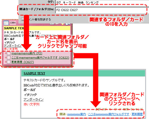 全カード共通の入力項目として「関連カード/フォルダIDs」という欄があります。 これは、関連するカードやフォルダのIDを記入することで、閲覧時にその関連するカードやフォルダにジャンプ(表示切替)することができるというものです。 ミームメモのフォルダやカードにはすべてIDがつけられています。 (フォルダのプロパティやカードのプロパティで確認できます) カード編集ダイアログにある「関連カード/フォルダIDs」という入力欄に関連するフォルダID(Fで始まるID)かカードID(Cで始まるID)を記入します。 空白で区切って複数のIDを羅列することができます。(無効なIDは削除されます) すると、カード編集モードで、カードの下部にリンク先のフォルダ/カード名が表示され、これをクリックすると当該カード/フォルダを開くことができるのです。 ただし、グループ指定されたフォルダやカードについては閲覧権限のあるグループメンバーにのみ表示されます。 また、これをWEB公開(HTML出力)した場合には、関連フォルダ/カードのうち、WEB公開されているフォルダ/カードのみがウェブ上のリンクとして表示されます。 |