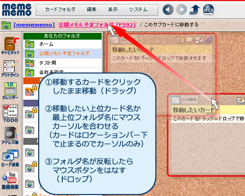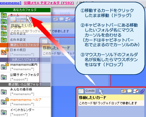 5-5及び5-6で、ドラッグ&ドロップで選択したカードを同一フォルダ内のサブカードや上位階層に移動することができることをご説明しました。 では別のフォルダに移動するにはどうしたらよいでしょう? それにはキャビネット機能を使います。そう、キャビネットバー上のフォルダ名にドラッグ&ドロップができるのです。 1)まずキャビネットアイコンをクリックしてキャビネットバーを表示させます。 2)移動したいカードをクリックして選択します。SHIFTキーやCTRLキーを押したまま選択することで複数選択も可能です。 3)選択したら、そのカードの余白をクリックしたままマウスを動かして移動(ドラッグ)します。 4)キャビネットバー上の移動先となるフォルダ名にマウスカーソルを合わせると、移動矢印マークが表示されます。 (カードはキャビネットバー上に移動できませんが、マウスカーソルだけ移動できます) 5)そこでマウスボタンを放す(ドロップする)と、ドラッグしたカードが画面から消え、指定したフォルダ内に移動されているはずです。 【注意】 カギマークの付いたフォルダは閲覧のみ可能なのでドロップできません。 また、他人のフォルダに移動すると、編集権限がその人に移りますので、カード内容の編集とコピー・削除はできますが、そのカードを再び移動させることはできませんのでご注意ください。 |