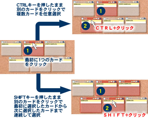 カードを選択するには、カード最上部のバー=カードバーをクリックしてください。 するとカードバーの色が変わり、選択状態になったことを表します。 複数カードを選択する場合、2つの方法があります。 1つはCTRLキーを使う方法です。 CTRLキーを押したまま、カードバーをクリックしていくことで、任意の複数のカードを選択状態にすることができます。(間違えて選択したら再度CTRLキーを押したままクリックすれば選択を解除できます) もう1つはSHIFTキーを使う方法です。 あるカードを選択してから、SHIFTキーをクリックして別のカードをクリックすることで、整列順(初期状態では作成順ですが、アウトラインエディタで並べ替えれば、その順番)で指定範囲に含まれるカード全てを一括で選択状態にすることができます。 更にその後CTRLキーを押したままクリックすることで選択/選択解除を切り替えることができます。 |