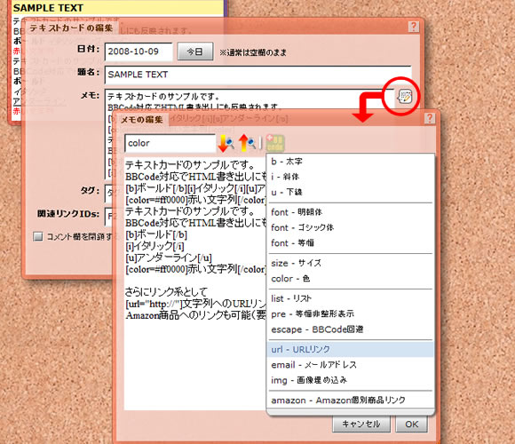 各カードに共通のメモ欄はBBCodeで文字装飾やリンク設定をすることができ、ウェブ公開する際にはそのBBCodeがHTMLタグとして継承されます。 ただ、通常のダイアログ上のメモ欄はスペースが狭いので、長い文章や装飾をしたい時にはちょっと不便です。 そこで、入力欄の右にある「メモ編集」アイコンをクリックすると、メモ編集ダイアログが開きます。 メモ編集ダイアログの入力欄では、マウスの右ボタンメニューやキーボードショートカットによる文字列のコピー(CTRL+C)およびカット(CTRL+X)&ペースト(CTRL+V)が可能です。 また、ダイアログのサイズも右下のリサイズハンドルをドラッグすることで変更できます。 ダイアログの上部には、長文編集用に、文字列検索指定欄と、BBCode入力メニューを表示するBBCode入力ボタンがあります。 文字列検索は文字列入力欄に書かれた文字列を前方(下向き)検索ボタン/後方(上向き)検索ボタンをクリックすることで検索することができます。 BBCode入力ボタンは通常グレーでクリックできませんが、カーソルが入力欄にある状態でのみクリックできます。 BBCode入力ボタンをクリックすると、プルダウンメニューが表示され、そこからBBCodeを選択すると、入力欄のカーソル位置にBBCodeが挿入されます。 メニュー内容は、ミームメモで使える主なBBCodeになります。 詳しくはBBCodeのヘルプをご覧ください。 このメニューで便利なのは、文字列選択した状態で挿入すれば、その文字列を囲むように前後にBBCodeタグが入る点です。 たとえば、入力欄にカーソルがあっても範囲指定されていない状態でBBCodeメニューから「B(太字)」を選択しても、カーソル位置に[b][/b]というタグが挿入されるだけです。 しかし、「ここを太字にします」という文章の「太字」という二文字をマウスで範囲指定した状態で、BBCodeメニューから「B(太字)」を選択します。 すると、入力欄で範囲指定していた「太字」という文字の前後にタグが入り、「ここを[b]太字[/b]にします」となります。 例外は文字列に画像を埋め込む[img]タグで、これだけは選択を無視して先頭部分に挿入します。 また、URLとEmailの場合、範囲指定してない状態で、URLリンクのBBCodeを挿入すれば[url]http://[/url]になり、Emailの場合は[email][/email]というタグが入ります。 これらの場合、URLならhttp://に続くURIを、Emailならメールアドレスを入力する形になります。 しかし、文字列に対してURLやメールを指定すると以下のようになります。 「ミームデザイン」を選択した状態で「URLリンク挿入」を選べば、上記と異なり、[url="http://"]ミームデザイン[/url]となります。 「問い合わせメール」を選択した状態で「Emailリンク挿入」を選べば、[email=""]問い合わせメール[/email]となります。 リスト状態にする[list]タグの場合には、範囲選択されていれば、改行ごとに[*]項目に変換されます。 たとえば 計画 実行 検証 反省 という4行を選択した状態でリストを選択すれば、 [list] [*]計画 [*]実行 [*]検証 [*]反省 [/list] となります。 |