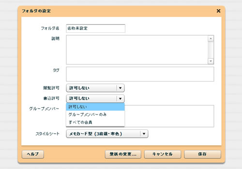 現在表示しているフォルダの設定を変更することができます。(新規作成時のダイアログと同じです) このコマンドを選択すると、フォルダ設定ダイアログが表示されますので、フォルダ名、コメント、読み込み属性、書き込み属性、グループIDリストを編集することができます。 また、フォルダ単位で背景の画像をアップロードして好きな画像に変更することができます。 下記関連トピックをご覧下さい。 |