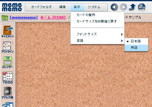 メニューの言語を英語モードに切り替えることができます。 これは暫定的な切替ですので、通常の言語はログイン時の言語モードによって決まります。 |