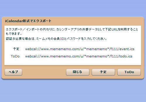 このメニューを使うと、現在開いているフォルダ内の予定カードと〆切日付の設定されているToDoカードの予定をiCalendar形式(ics形式)で出力します。 出力するicsファイルは2種類、予定(イベント)データとTODOデータがあります。 (ただしインポートする側のサービスやツールでTODOデータを読み込めるものは今のところかなり限定されます) icsファイルをダウンロードし、インポート可能なソフトやサービスでそのファイルを読み込むことで、エクスポートした予定データをインポートできます。 また、ファイルをダウンロードしたりアップロードしなくても、icsファイルのURL出力に対応していますので、他のウェブサービスなどからicsファイルのURL参照ができる場合は、このダイアログに表示されるURLを指定して下さい。 他のソフトやウェブサービス側でiscファイルを参照する際に、認証アクセスが可能な場合はクローズドなフォルダでもミームメモのID/パスワードを入力することでアクセスできます。 また、認証不要のURLを発行する機能が追加されました。 認証不要のURLを利用する場合は、[認証が不要なURLを発行する]ボタンをクリックすることで、認証不要URLが表示されますので、このURLをコピーして、インポートする側のソフトやサービスで指定してください。 これにより、カレンダー機能を持つソフトやウェブサービス側から、毎度認証用のID・パスワードを求められることなく、指定したURLでカレンダーデータを参照してくれます。 ただし、このURLを他の人に知らせると、指定したフォルダのカレンダー情報が閲覧可能になってしまいますので取り扱いにご注意下さい。 逆に、グループで共有しているスケジュールフォルダなら、グループメンバー共同で利用する為に、フォルダ所有者がこの機能を利用してURLをメンバーに通知してください。 このURLを無効にしたければ、同じメニューから「認証が不要なURLを破棄する」を選択して、このURLを無効にしてください。 ※iCalendar形式とは標準化された予定データの交換用フォーマットですが、タグなどが豊富な為、サポートしているウェブサービスやソフトウェアでも読み込めない場合があることをご了承下さい。 現状ウェブサービスとしてグーグルカレンダー、ソフトウェアとしてマイクロソフトアウトルックでのインポートを確認しております。 アウトルックではインポート・更新と別予定表として開くことができますが、グーグルカレンダーでは追加のみとなります。 |