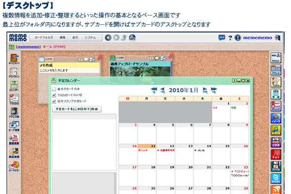 ミームメモの画面は、おおきく4つに分けられます。 画面の大半を占める領域がデスクトップで、データカードを置いておくところです。 ここには、フォルダやカードを編集したり、環境設定を変更するダイアログや、カレンダーなどのアプリケーションが表示される領域です。 このデスクトップのまわりに4種類のバーがあります。 画面上部の、パソコンソフトによく見られるメニューやアイコンが並んでいるバーをツールバーと呼びます。 その下にあるのがロケーションバーです。 ミームメモでは、複数のフォルダを作成し、カードを内容や種類に応じて自由に入れられます。 ロケーションバーには、デスクトップに開くフォルダを選択したり、他の会員のフォルダを開いたりするフォルダアイコンと、現在デスクトップに開いているフォルダ(あるいはサブカード)についての階層情報やフォルダオーナーの情報が表示されます。 画面の左サイドに縦に並んでいるのはアプリケーションバーです。 アプリケーションバーのアイコンをクリックするとデスクトップ上にウィンドウが開きます。目的に応じてカードの情報を検索・抽出したり、カードを追加・編集したりすることができます。 画面の右サイドに並んでいるのは新規カード作成バーです。 作成したい種類のカードアイコンをクリックすれば、現在表示しているデスクトップ上にカードを追加する為のダイアログが表示されます。 |
