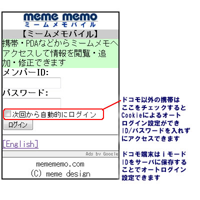 これがミームメモバイルのログイン画面です。 携帯の自動ログインに対応し、auやソフトバンクの場合はCookieを使って2回目以降IDやパスワードを入力せずに自動的にログインできるようになっています。 ドコモ端末ではCookieが使えない為、「自動ログイン設定」をすると、端末のID(iモードID)をサーバ上に保存しますのでご了承下さい。 |