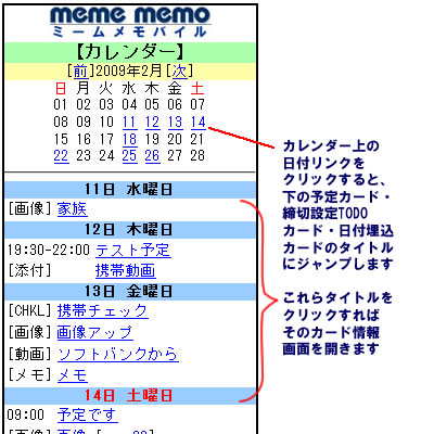 のいずれかが入ったカードがある場合に、その日付がリンク表示になります。 日付リンクをクリックすると、カレンダーの下にあるカードのタイトルにスクロール(ジャンプ)します。 さらにこのタイトルをクリックすると、そのカード情報を表示します。 |