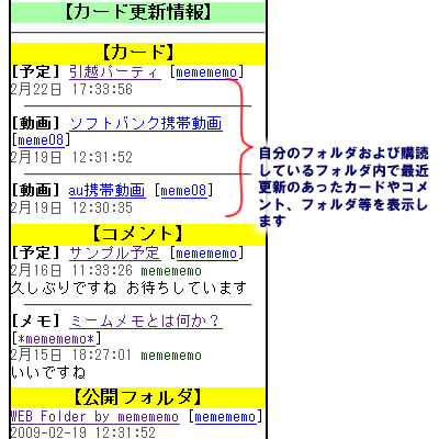 トップメニューからデータ更新情報を選択するとこの画面が表示されます。 ここには、カード、フォルダ、コメント別に、自分のフォルダと公開フォルダで最近追加・更新されたカードのタイトルが一覧で表示されます。 自分の公開フォルダに友達の新しいカードが追加されたり、購読している会員のフォルダ内のカードが更新されたりすれば、ここに表示されます。 気になったカードタイトルをクリックすれば、そのカード情報表示画面を開きます。 |