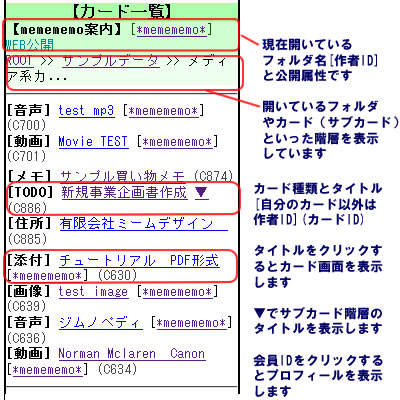 トップメニューなどからフォルダを選択したり、サブカードを開いたりすると、この図のようにカードタイトルの一覧が表示されます。 上部には現在開いているフォルダ名(フォルダ作者ID)と公開属性が表示されます。 その下には現在開いている場所(フォルダ直下ならROOT、サブカードであれば、親カードなど)がパンくず型のメニューのように並びます。 ここをクリックすることで上位階層へ戻ることもできます。 その下にカードタイトルが一覧で並んでいます。 表示されるのは、カード種類、カードタイトル、カード作者(自分の場合は非表示)、カードIDです。 また、サブカードを持っているカードの場合、▼マークのリンクがありますので、これをクリックするとその階層(にあるカード一覧)に移動できます。 カードタイトルをクリックすればそのカード情報画面が表示されます。 また、他の会員が作ったカードであれば、その会員IDをクリックすると、その会員のプロフィールを表示します。 |