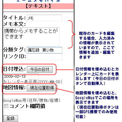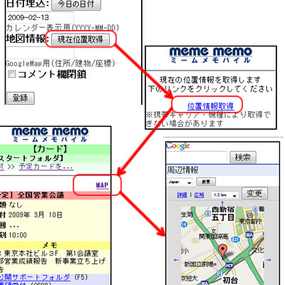 アップデートされたミームメモバイルについて簡単にご紹介しておきます。 まず、ウェブ版と同じように、自分のフォルダはもちろん、お気に入りや公開フォルダを分類して閲覧しやすくなりました。 さらに、自分のフォルダはもちろん、書き込み可能なフォルダなら自由にカードを追加作成したり、編集・削除したり、コメントを付けることができるようになりました。 さらに、これまで追加できるカードはメモ・アドレス・予定・ToDo・チェックリストの5種類だけでしたが、すべての種類のカードを作成できるようになりました。 携帯のキャリアや機種によってアップロード及び閲覧できるデータのサイズやファイル種類に制限はありますが、携帯で撮った写真やムービーを画像カードや動画カードにしたりできるのです。 また、PC版でもモバイル版でも、すべてのカードに位置情報を付与できるようになりました。これにより、カードに関連する場所をGoogleMap上で確認することができます。(以前アドレスカードのみ持っていた項目です) この地図情報埋込欄には、住所や有名なビル名が入れられますが、地図座標を入れることもできます。 そして、ミームメモバイルを使うことで携帯のGPSを使って、カードに位置情報を簡単に埋め込むことができるようになっています。(こちらもキャリア・機種により非対応の場合があります) これにより、例えば携帯で動画や写真・動画を撮って、それをカードとしてミームメモバイルにアップロードする際に、携帯のGPSでその撮影場所の位置情報を埋め込むことができるのです。 |