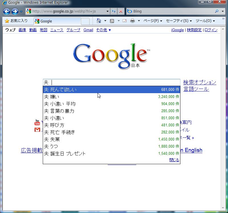 ちょっと前に話題になったグーグルの検索予測(Google Suggest)で「夫」の後に出てくる予測語が怖いっての。 元ネタというかどっちが先かわからないけど、米国ではautocompletemeというブログができていてこっちも話題になった。 ただ英語なので微妙ゆえ、サブカードにおもしろいものをいくつか訳してみた。 元ネタサイトはこちら |