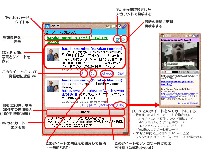 ミームメモは13種類のメモカードを作成することができます。 その1つがTwitterカードで、検索式などを設定しておくことで、ツイッター上のつぶやきを抽出してリストアップしてくれます。 また、検索式の欄にリスト名を入れることでTwitterのリストを表示させることもできます。 いくつもの条件を別々のカードにしておくことで、都度検索したり個々のアカウントのホームを開くことなく、一覧で表示させることができるわけです。 更に、Twitter認証設定をしておけば、ここからTwitterにつぶやきを投稿したり、返信したり、引用したり、公式ReTweet(再配信)することもできます。 (ミームメモのRetweet・RTの扱いについてはコチラ) (認証設定方法はコチラ) また、CLIP機能により、メモしたいつぶやきがあればその場でミームメモのカードにすることができるようになりました。 通常はテキストメモカードですが、つぶやきの中に画像や動画、PDFなどへのURLリンクがあれば対応するメディアカードに変換されます。