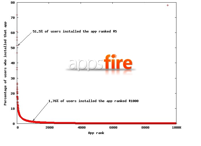 AppStoreの登録アプリケーション数が10万本を突破、ダウンロードの累計回数は20億回以上(11/4付のAppleのリリースより) ただ、AppFireによればDLされたアプリの8割以上はほとんど使われていないとか?(メディアパブより) 参照先は下記(グラフはAppFire.comの記事より) ・Apple Announces Over 100,000 Apps Now Available on the App Store(Apple,プレスリリース) ・Good news: the App store grows to 100k apps/ Bad news: The long tail is VERY long [exclusive appsfire data](AppsFire.com) ・Appsfire figures that most Apps aren't very successful(9 to 5 Mac) |