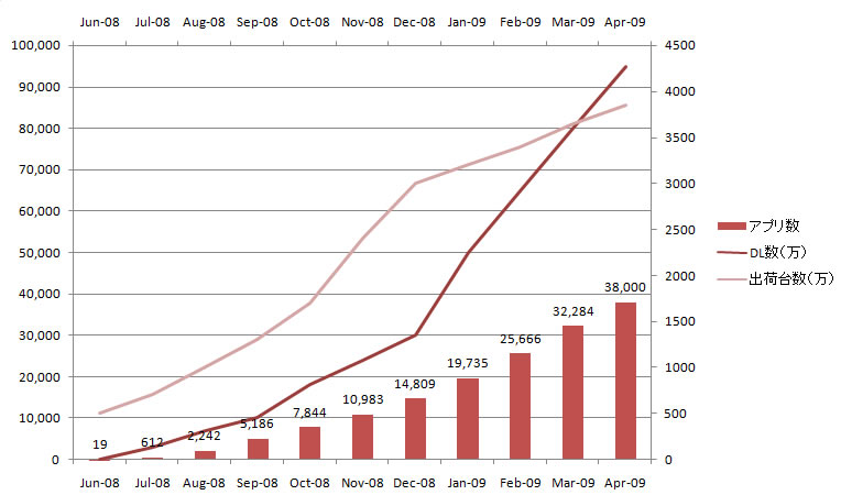 勢いはとどまるところをしらないAppStoreのダウンロード数、10億ダウンロードカウントダウンをやってましたが、今朝(4/24早朝)突破した模様。 手持ちの資料を元に出荷台数とアプリ数とDL数の推移をグラフ化してみました。適当にグラフの線を補完していますが、だいたいこんな感じであろうとおもいます。 ホリデーシーズンの後に出荷は当然下がりはしていますが、DLはホリデーシーズンから落ちることなく上昇しています。アプリ数の増大もすごいながら、やはり無料タイトル含め38000本のソフトというのはなかなか大変な市場であり、裏を返すとここに参入するのは楽でも、トップを取るのは相当厳しいことも事実でしょうね。 |